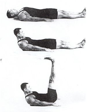 Ce rite renforce les abdominaux et le cou, stimule le centre énergétique du plexus solaire et tonifie le pancréas et la thyroïde. le bas du dos doit impérativement rester collé au sol même si on arrive pas à mettre les jambes d’équerre (sinon il y a risque de douleurs lombaires).